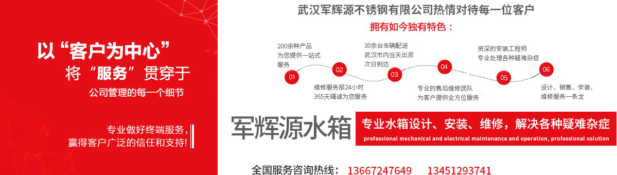 武漢軍輝源不銹鋼有限公司是華中地區(qū)專(zhuān)業(yè)生產(chǎn)不銹鋼水箱的環(huán)保企業(yè),公司集不銹鋼水箱開(kāi)發(fā)設(shè)計(jì)、生產(chǎn)、銷(xiāo)售、維修、售后服務(wù)為一體。